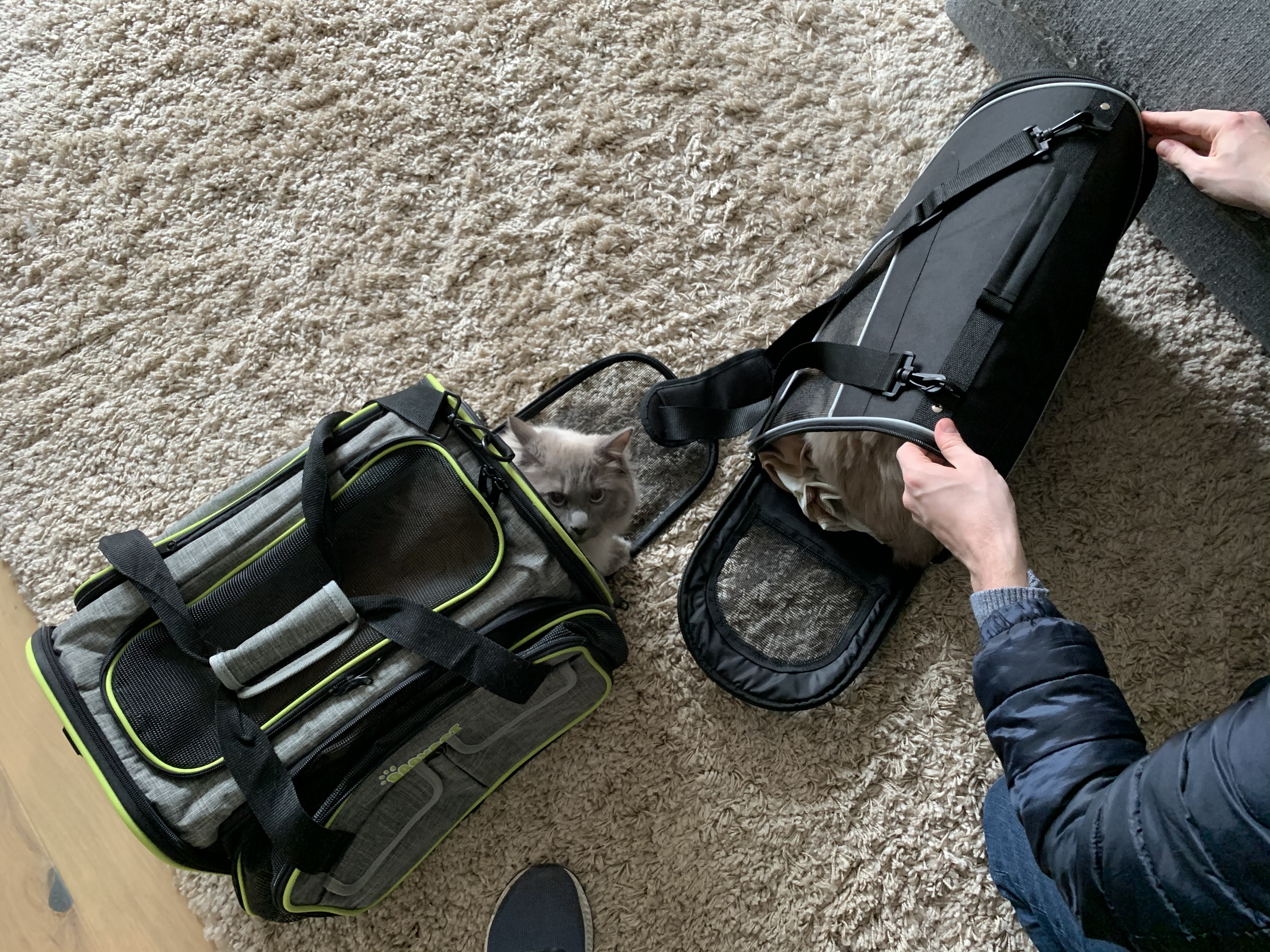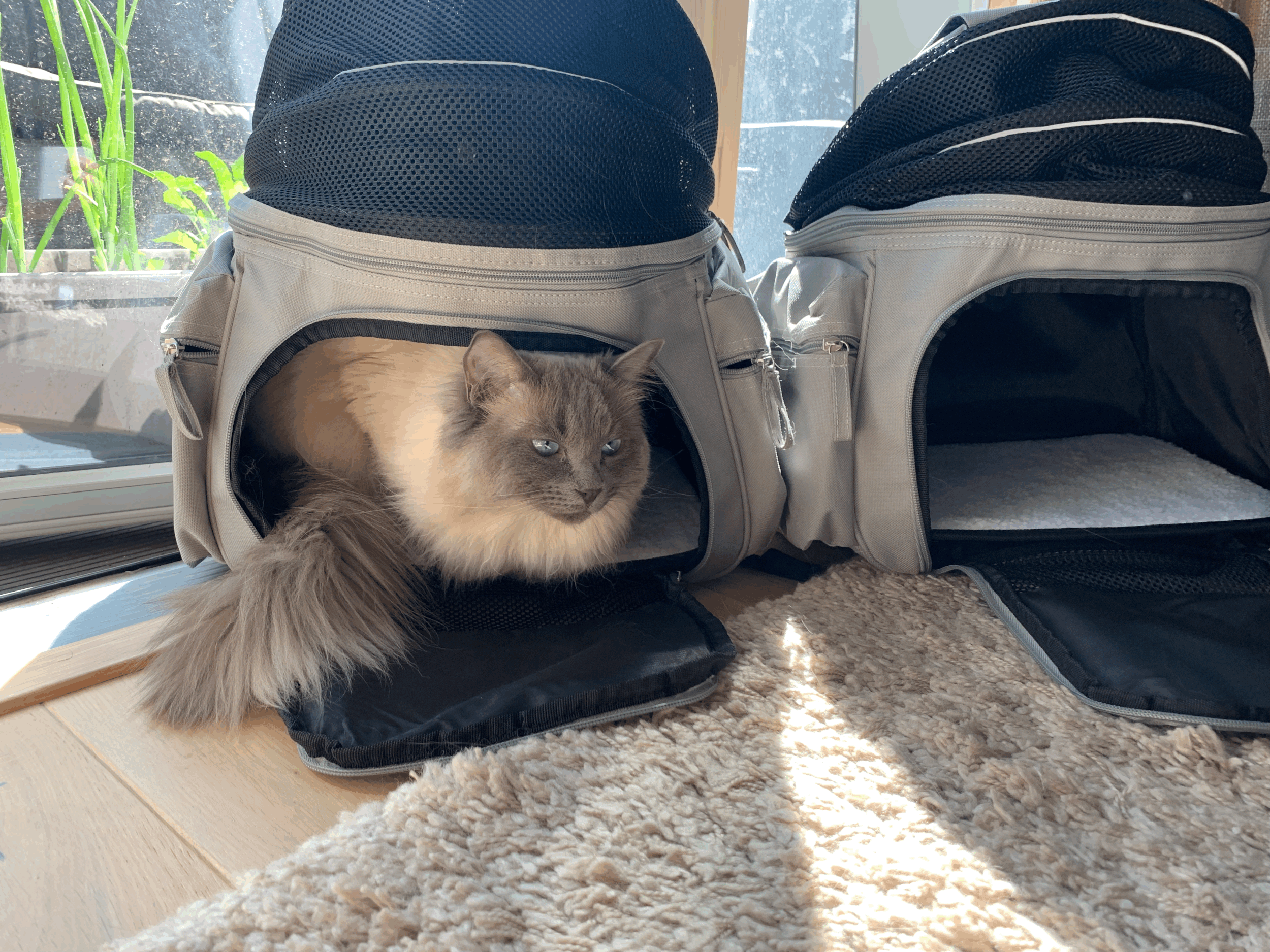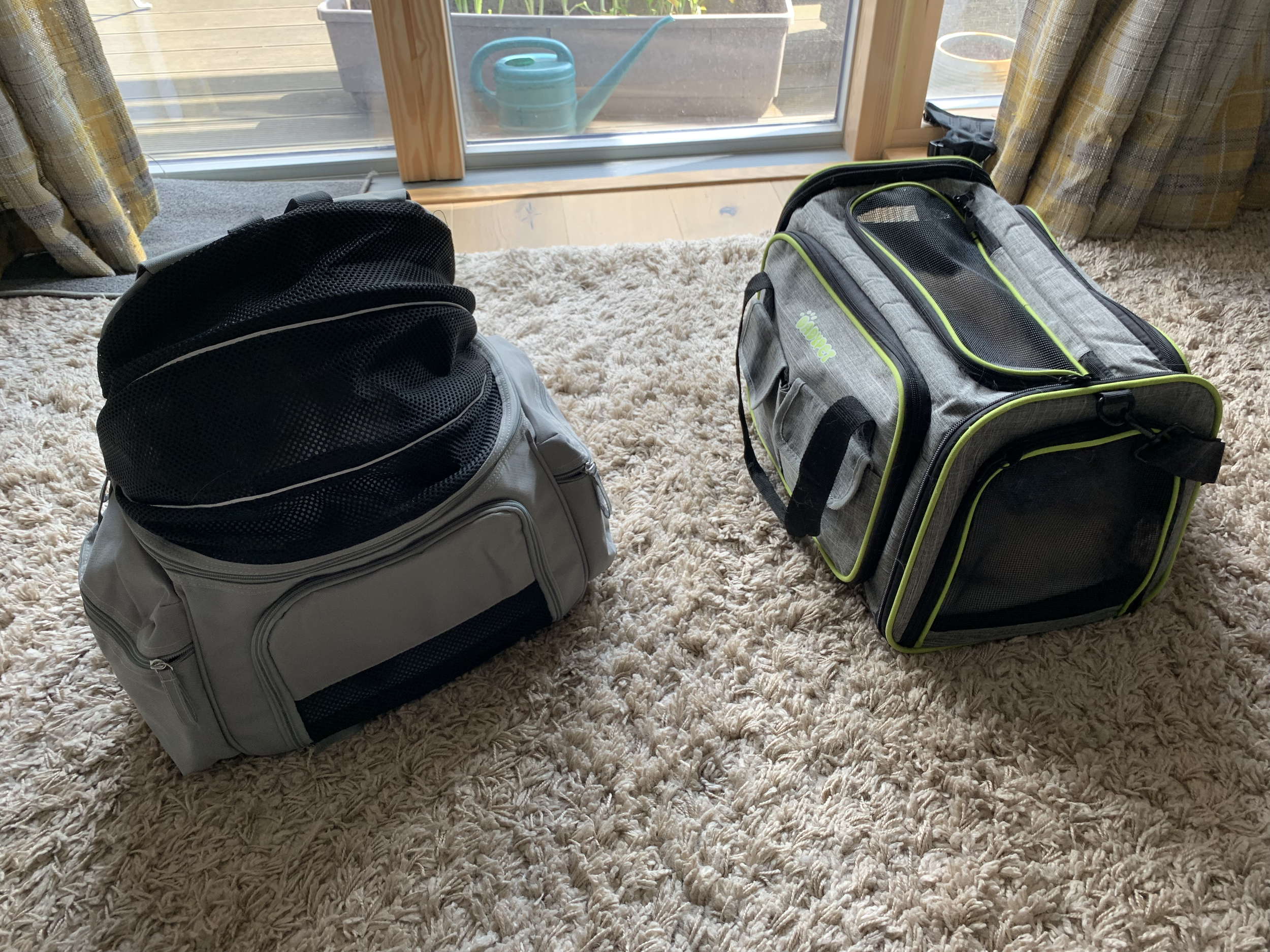 I knew I needed at least one new carrier then, if not two. I undertook quite a bit of research online about sturdy carriers which were escape-proof over a long period of time, and also spacious enough for them to be comfortable too. I initially looked at handheld carriers like those I already owned, but I soon became drawn to a backpack style instead. My thinking was it would be much easier to carry them on our backs when we would also be lugging around our other luggage too. I was a bit worried they wouldn’t be strong enough, and that it also might look a bit silly, but after some umm-ing and ahh-ing I went for it. The reviews suggested it was in fact a sturdy option, and I managed to find one a bit more discretely designed. I didn’t want it to be entirely obvious we were carrying cats around on our backs, and for the cats themselves to be awarded sufficient privacy to not feel exposed. I ordered two and waited for them to arrive.