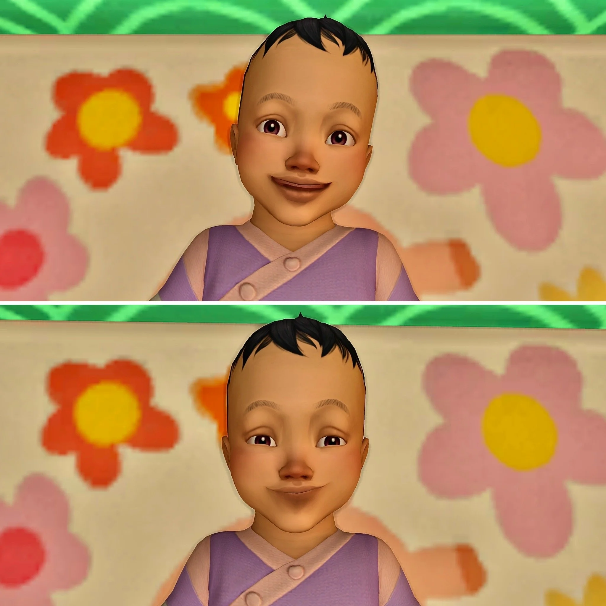 She is the CUTEST! And also the perfect combination of her parents, with Betsy’s purple eyes and Sul Sul’s dark hair.